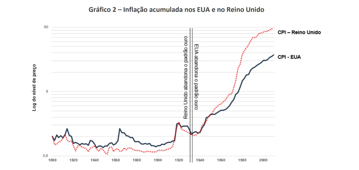 O motivo que levou a essa mudança brutal de inflação foi o fim da adoção do padrão ouro pelos Estados Unidos e Reino Unido, o que deu flexibilidade para os bancos centrais aumentarem a oferta de dinheiro na economia. Essa maior flexibilidade traz alguns benefícios pois possibilita políticas monetárias estimulantes em ambientes de crise, mas por outro lado traz também o risco de inflação. O gráfico 1 também evidencia esse efeito pois, até a década de 1930, o valor do ouro e do dólar eram intimamente ligados. Essa ligação deixou de ocorrer desde então.