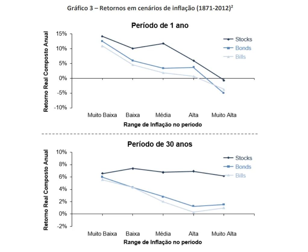 Os dados indicam que, conforme indicado anteriormente, em períodos longos o suficiente, o ambiente inflacionário pouco importa para determinar o retorno de ações. No entanto, para o curto prazo, ações acabam se beneficiando quando a inflação é baixa.