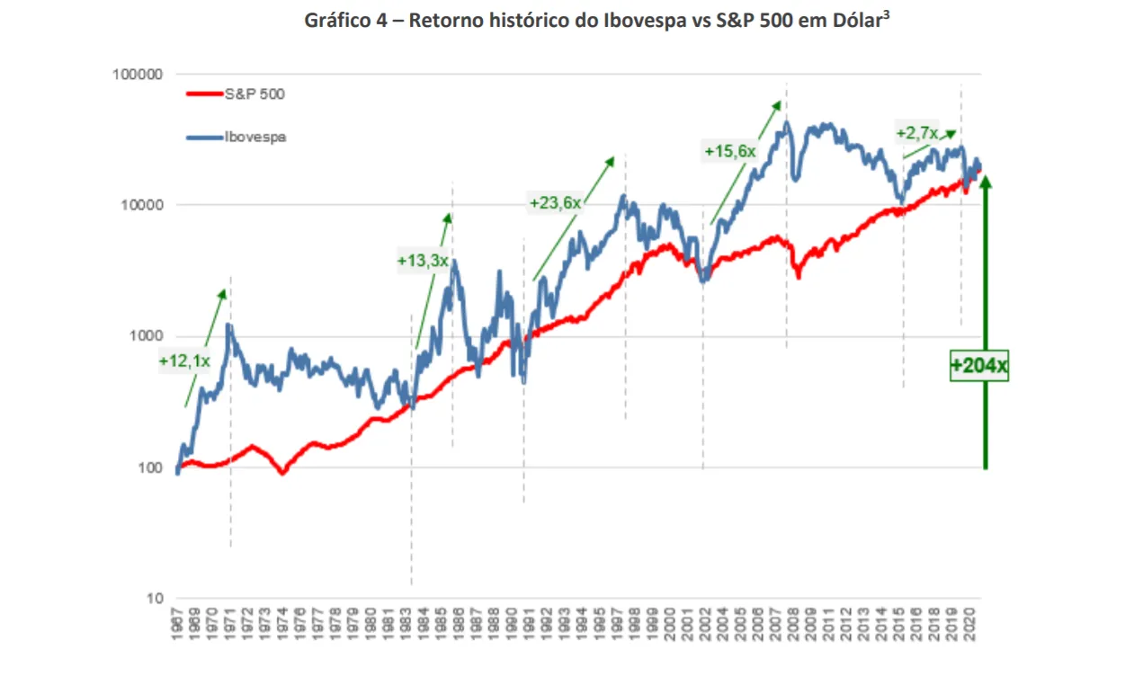 Desde a criação do Ibovespa, em Jan/1968, até Mar/2021, o Ibovespa teve um retorno real (acima da inflação) em dólar de 26,3 vezes (equivalente a uma taxa anual de 6,33% a.a.), comparado a 25,3 vezes do S&P 500 (6,26% a.a.) no mesmo período.