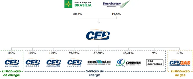 A empresa atua nas áreas de distribuição, geração e comercialização de energia através de 8 empresas subsidiárias. A figura abaixo apresenta a organização societária da CEB: