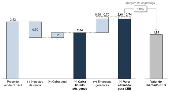 Com a CEB-D privatizada pelo valor de R$ 2,515 bilhões, estimamos que a empresa irá pagar cerca de R$ 700 milhões em impostos e, somado ao caixa já existente de R$ 225 milhões a empresa passará a ter uma posição de caixa líquido de R$ 2,04 bilhões, ao mesmo tempo em que seu valor de mercado é de R$ 1,95 bilhões[3] – ou seja, só o caixa da empresa vale mais do que seu valor atual na bolsa!