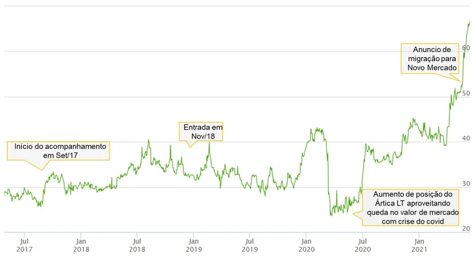 A empresa é negociada sob a forma de BDR[1] na bolsa e, por esse motivo, acaba sendo pouco coberta por boa parte dos investidores. Essa situação mudou em Maio de 2021, quando a empresa anunciou a intenção de converter as BDRs em ações e passar a ser listada no segmento de novo mercado da B3. Esse simples movimento chamou a atenção para a ação, o que contribuiu para uma valorização da empresa em 24,8% desde o dia do anúncio[2].
