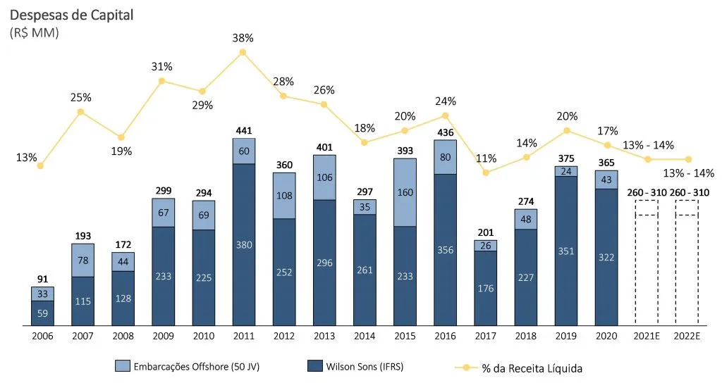 Conforme mencionado anteriormente, a Wilson Sons realizou investimentos significativos na última década. Destaque para a expansão no tecon de Salvador, que foi concluída em março de 2021 e levou a um aumento de capacidade de 110%. Agora, especialmente na operação de tecons, a empresa possui bastante espaço para crescer sem a necessidade de novos investimentos por vários anos e pode permitir uma elevação nos dividendos.