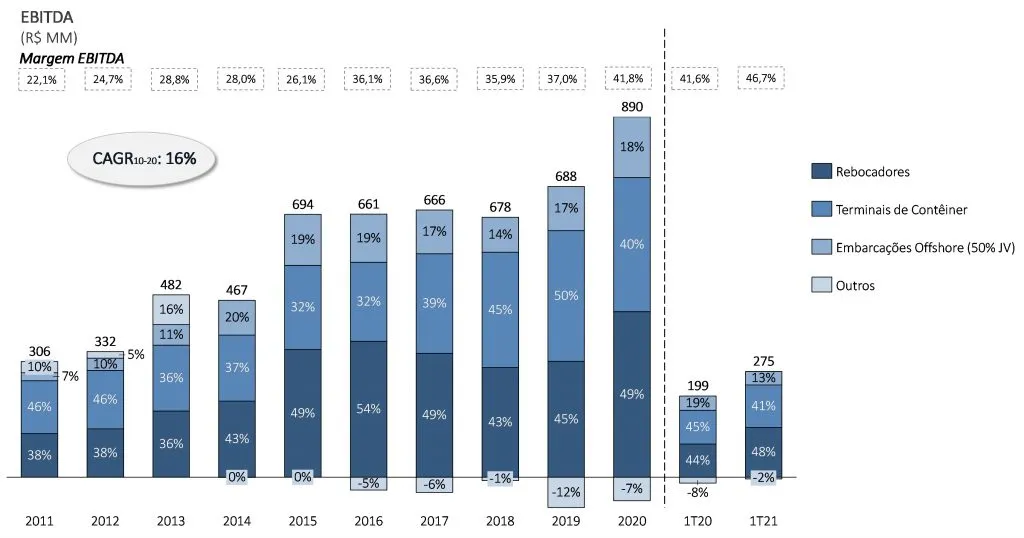 Rebocadores (42% da receita de 2020, e 45% do EBITDA):