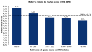 A Aurum, uma gestora de funds of funds (fundos especializados em selecionar e investir em cotas de outros fundos), analisou os retornos de hedge funds entre 2010 e 2018. No início do período, havia cerca de 1.700 fundos que acumulavam USD 1,7 trilhões sob gestão, e no final do período havia 3.800 fundos com USD 3,2 trilhões sob gestão. Encontraram uma correlação clara entre o tamanho do fundo e a rentabilidade: enquanto fundos “micro” (menos de USD 50 milhões sob gestão) tiveram retorno médio de 7,7% ao ano, os fundos “mega (mais de USD 5 bilhões sob gestão) tiveram retorno médio de 5,1% ao ano. A diferença é maior do que parece: USD 100 mil investidos nos fundos “mega” se tornariam USD 156 mil ao final dos 9 anos, enquanto o mesmo investimento nos fundos “micro” chegaria a USD 195 mil, um valor final 25% maior.