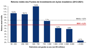 Para verificar se essa diferença de retorno também se aplicava aos fundos de ações atuantes no mercado brasileiro, coletamos dados de 1.049 fundos de investimento listados na CVM com patrimônio líquido a partir de R$ 50 milhões para o período de 2012 a 2021 e comparamos o retorno médio entre diferentes faixas de tamanho. O resultado foi similar. Não há erosão de retorno até a faixa dos R$ 750 milhões, mas o retorno médio começa a se reduzir depois disso. Enquanto os fundos menores que R$ 750 milhões tiveram um retorno médio de 10,61%, os maiores de R$ 5 bilhões tiveram retorno de 0,66%. Ou seja, R$ 100 mil investidos nos fundos grandes se tornariam R$ 107 mil ao longo desses 10 anos, enquanto o mesmo investimento, nos fundos pequenos, chegaria a R$ 274 mil, levando a um valor final 157% maior.