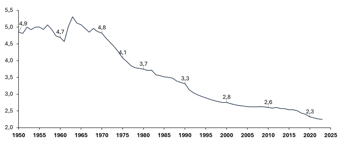 A queda da fecundidade não é um fenômeno tão recente, mas foi bastante abrupto de um ponto de vista histórico. Em pouco mais de 60 anos, a fecundidade global caiu pela metade. Os gráficos abaixo colocam em perspectiva o tamanho da mudança ao longo das últimas décadas.