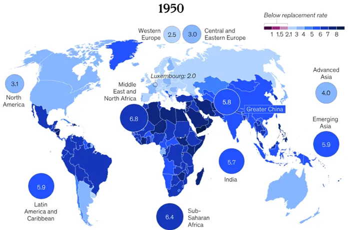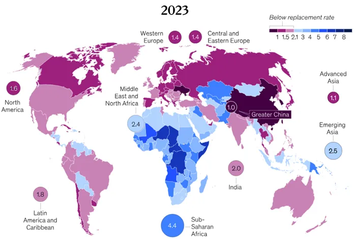 Para manter a população, as mulheres precisam ter, em média, 2,1 filhos ao longo da vida. Hoje, a taxa de fecundidade média do mundo é de 2,3, levemente acima da taxa de reposição, mas com uma distribuição bastante desigual. O mundo subdesenvolvido ainda tem taxas de fecundidade altas, enquanto países onde vivem dois terços da população mundial já têm fecundidade abaixo da taxa de reposição, incluindo todas as economias desenvolvidas do planeta.