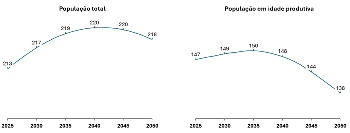 O Brasil está em uma faixa demográfica intermediária. Nossa população continua crescendo e deve atingir seu pico ao redor de 2040, mas a taxa de fecundidade brasileira em 2023 foi de 1,6 filhos por mulher, estando já abaixo da taxa de reposição. O lento crescimento populacional que ainda é esperado vem do aumento da expectativa de vida. A população em idade produtiva atingirá seu pico um pouco antes, perto de 2035, mas o crescimento até lá será de apenas 1,6%, não havendo mais bônus demográfico relevante daqui para frente.