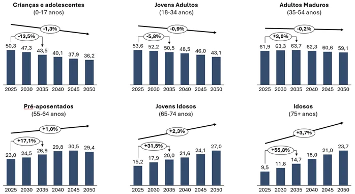 Os impactos mais relevantes para o Brasil virão da mudança do perfil demográfico. Adaptamos as projeções do IBGE para encaixá-las nas faixas etárias conforme as fases de vida que descrevemos acima. Assim, podemos interpretar os dados de forma qualitativamente mais relevante para refletir sobre possíveis cenários de consumo e de investimentos no país.