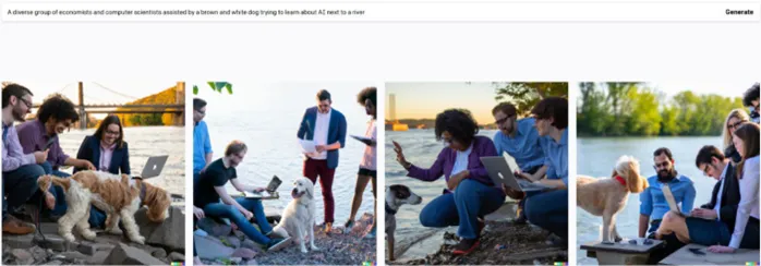 Sem entrar na discussão filosófica de se essa mecânica de previsão a partir de modelos estatísticos equivale à inteligência humana, o fato é que esses modelos executam tarefas, até então impossíveis para um software, de maneira rápida, barata e melhor do que a maior parte dos humanos executaria. Por exemplo, uma IA chamada DALL-E gerou as seguintes imagens a partir da descrição: “um grupo diverso de economistas e cientistas da computação, acompanhados por um cachorro branco e marrom, tentando aprender sobre IA perto de um rio.”