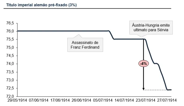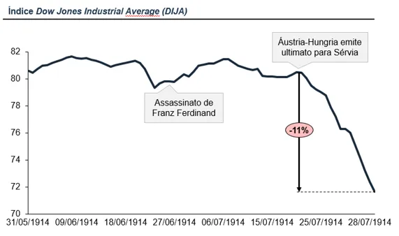 Por quase um mês após o assassinato do arquiduque, os mercados financeiros não reagiram. Nem o valor das ações do Dow Jones Industrial Average (DJIA) tampouco dos bonds do governo alemão pareciam precificar a perspectiva de guerra. Foi somente quando a Áustria-Hungria emitiu um ultimato para a Sérvia que os mercados entraram em pânico e começaram a vender.