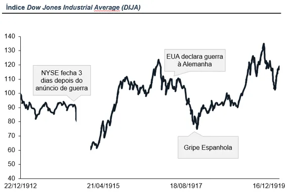 Numa perspectiva histórica, um investimento no DJIA em junho de 1914, as vésperas da guerra, mantido até hoje, no meio da pandemia de Covid-19 e queda generalizada das bolsas, teria propiciado um retorno de 9,8% ao ano[2] em dólares (dividendos reinvestidos), ou quase 20.000 vezes o capital investido. Em termos reais, trata-se de um ganho de 6,5% ao ano acima da inflação do período. Vale lembrar que este investimento passaria ainda por diversas outras crises severas como crash de 1929, a Segunda Guerra Mundial, a guerra fria, crise do Petróleo, Black Monday, ataque terrorista de 11 de setembro e a crise financeira mundial de 2008.