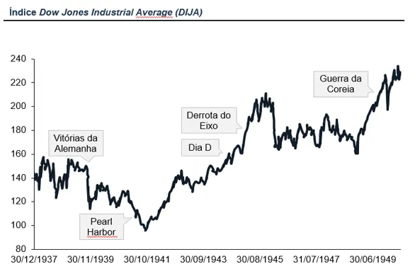 Como vemos no gráfico acima, o DJIA acompanhou o sentimento do desenrolar da guerra: entre 1940 e 1941, quando tudo indicava que as potencias do Eixo iriam prevalecer, o desdobramento dos fatos levou o índice a cair cerca de 33%. Quando a situação se inverteu, o índice engatou uma alta na qual mais que dobrou em um período de 4 anos. Um investimento pré-guerra de USD 1.000 em junho de 1939, teria se transformado em USD 2.900 em junho de 1950 , um retorno real médio de 4,8% acima da inflação no período.