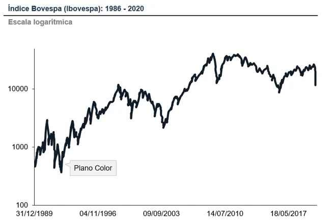Para ilustrar, pensemos em um investidor bastante “azarado” que tivesse investido no índice Bovespa antes do anúncio do Plano Collor, comprando o índice a 1.000 em dólares, e vendesse agora, no meio da pandemia de Covid-19, com o Ibovespa próximo a 12.000 também em dólares, teria um retorno nominal de 8,6% ao ano em moeda forte. Não é um retorno de se orgulhar, mas estamos falando de entrar e sair nos piores momentos possíveis.