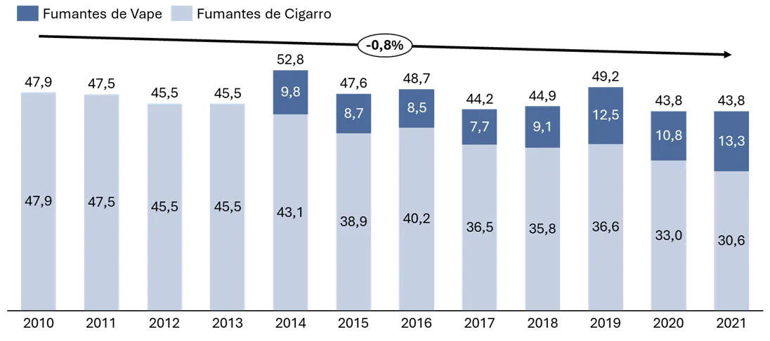 Número de fumantes de cigarro e vape nos Estados Unidos (milhões)