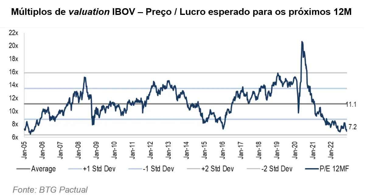 Além disso, hoje estamos vendo preços de ações bastante raros. Em nosso tempo atuando no mercado, só vimos algo comparável na crise do subprime, em 2009, e na crise do governo Dilma, em 2015. Com preços nesse patamar, algumas de nossas ações tem potencial para dobrar de valor nos próximos anos em um cenário macro moderado. Mesmo se a economia tiver um desempenho medíocre, essas ações ainda devem ter um retorno consideravelmente acima da taxa básica de juros. Investimentos em bolsa sempre terão um risco de perda em cenários catastróficos, mas a relação de risco e retorno atual nos parece bastante favorável em ações selecionadas. O gráfico abaixo deixa claro o quão baratas as ações estão: o múltiplo Preço/Lucro médio da bolsa está 35% abaixo de seu patamar médio.