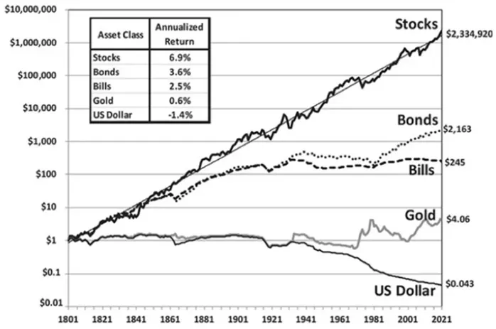 É essa filosofia de investimento que adotamos em nossos fundos e escolhemos investir em ações porque é a classe de ativos com maior retorno em longos períodos, ponto bem ilustrado por Jeremy Siegel, professor da Universidade da Pennsylvania (Wharton School), que levantou dados de investimentos nos Estados Unidos ao longo de 220 anos e os compilou no gráfico abaixo.