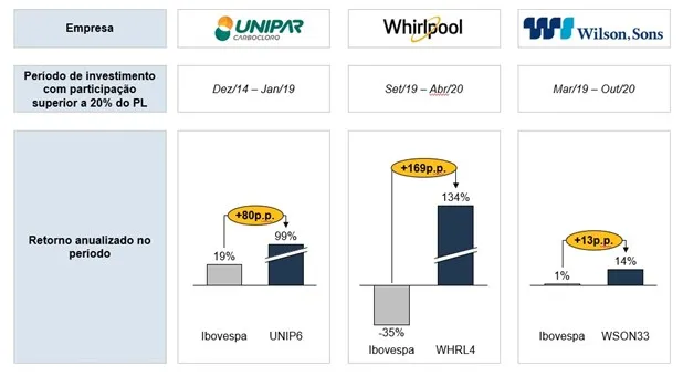 Ao longo de nossa história, já tivemos 3 investimentos que ultrapassaram a barreira dos 20% do portfólio. Em todas essas situações, os retornos obtidos foram muito superiores ao mercado em geral nos respectivos períodos e contribuíram significativamente para a performance histórica do Arcádia.
