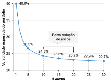 O gráfico abaixo ilustra esse conceito. Ele apresenta a volatilidade esperada de um portfólio de acordo com o número de empresas investidas e fica evidente que o perfil de risco de um portfólio com 10, 20 ou 30 ativos é muito similar.