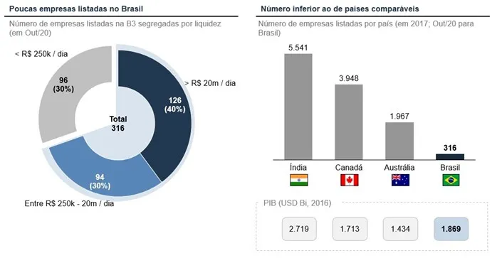 No Brasil, há uma quantidade de empresas listadas muito menor. Em outubro de 2020, existem 316 empresas listadas no Brasil, das quais 96 possuem baixíssima liquidez (menor que R$ 250 mil por dia), restando apenas 220 como legítimas oportunidades de investimento. Com uma barra de liquidez mais alta (R$ 20 mm por dia), o número de empresas que sobra é de apenas 126.