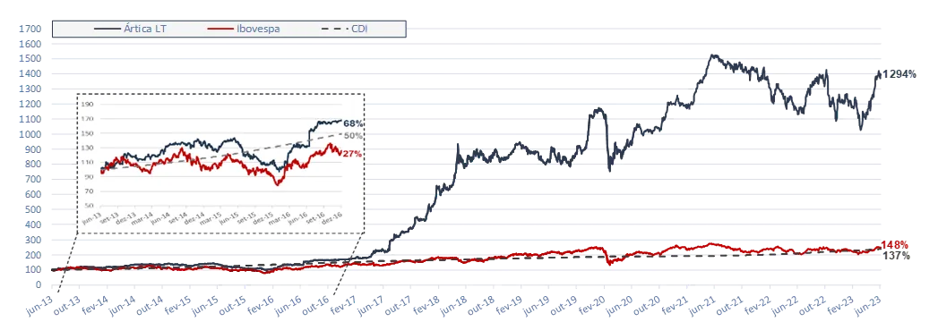 Fechamos nossa primeira década de investimento com retorno acumulado de 1.294% até 30/06/2023, correspondente a um retorno médio anual de 30% ao ano.