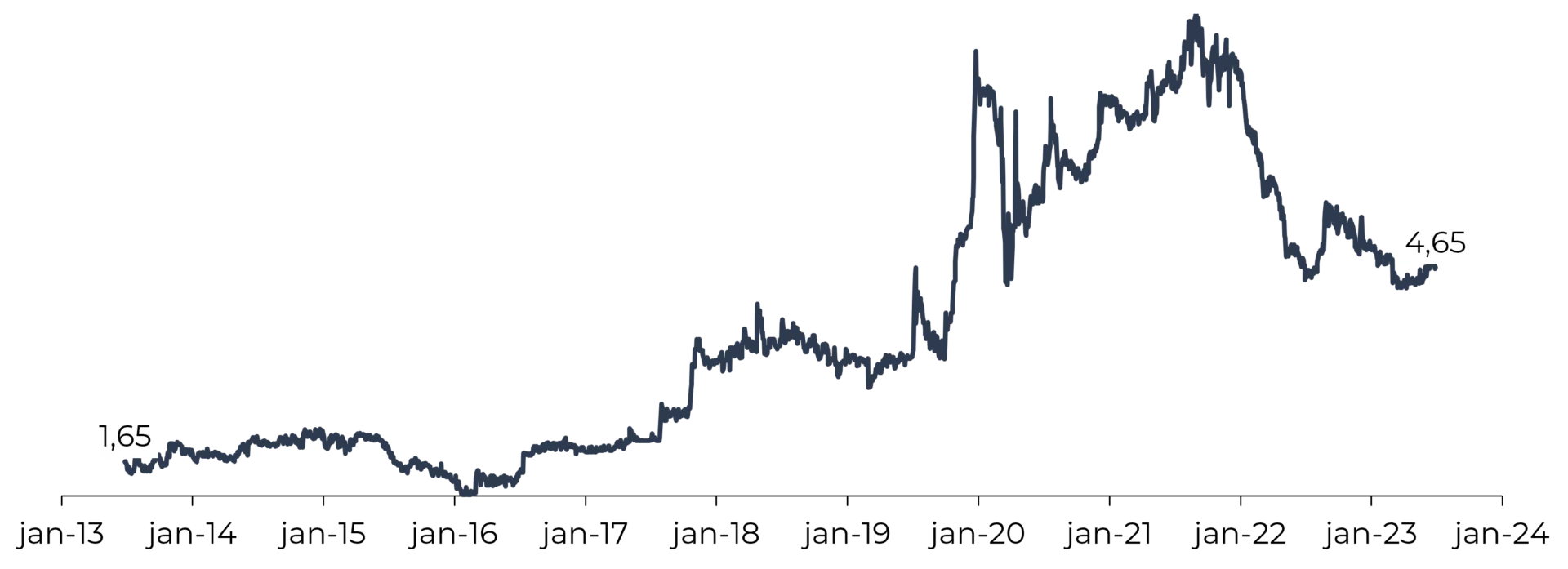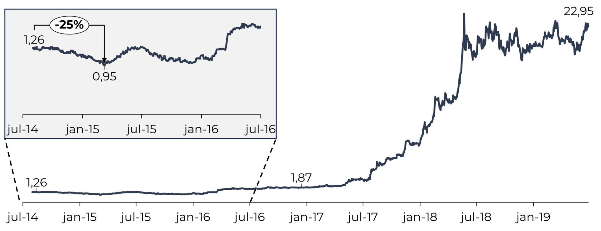 Nossa crença no valor da Unipar não foi compartilhada pelo mercado por bastante tempo. A ação só começou a subir em um ritmo mais expressivo a partir do segundo semestre de 2017. Ou seja, seguramos a ação andando de lado por 3 anos antes de ver a tese realmente se provar correta e o preço da Unipar subir rapidamente no ano seguinte. Vendemos toda a nossa posição em 2019, após 5 anos como acionistas. Nesse período, recebemos em dividendos quase o mesmo valor que havíamos pagado pelas ações, então a venda foi praticamente lucro puro e gerou um retorno ao redor de 20x o capital investido. A expansão de preço no período em que fomos acionistas está ilustrada no gráfico abaixo.