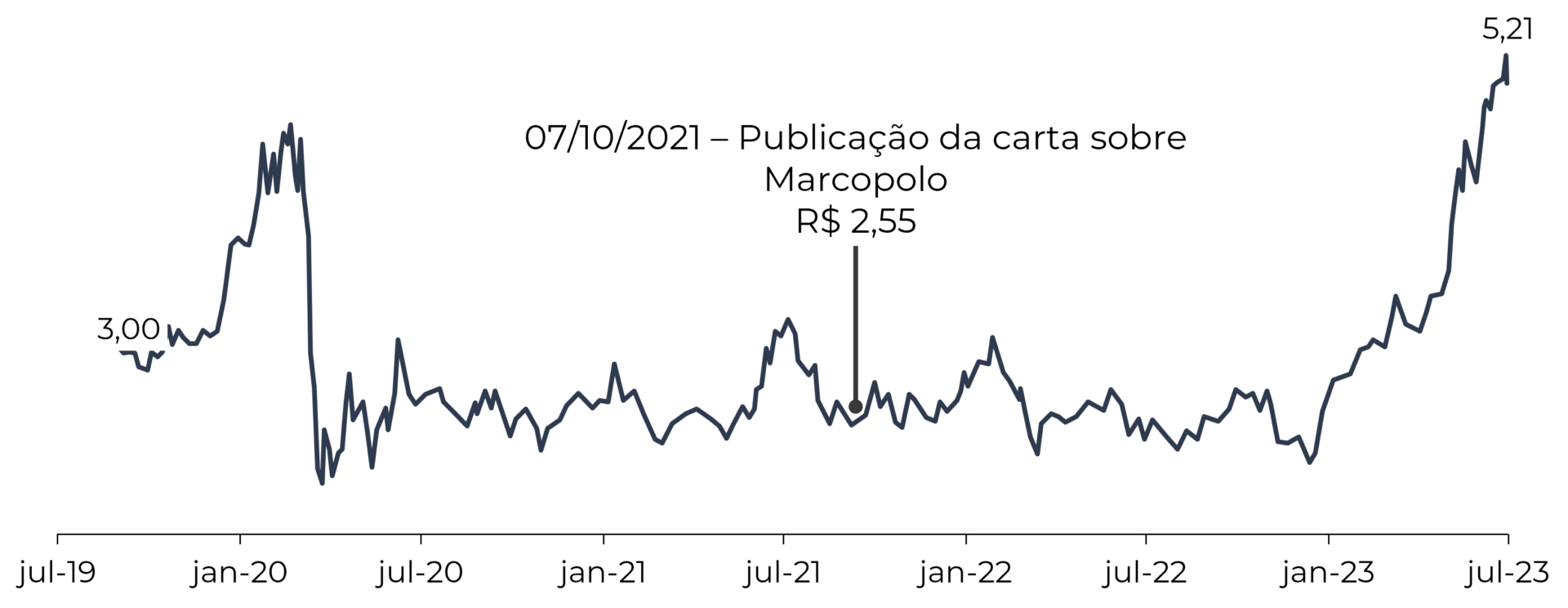 O caminho ao longo dos anos foi tortuoso. Os primeiros meses após nossas compras foram positivos, o preço chegou a subir cerca de 50%, até que veio a pandemia e a ação desvalorizou até 35% abaixo do nosso preço de compra. Revisamos nossas contas e a penalização parecia ser excessiva, então compramos mais ações da Marcopolo.