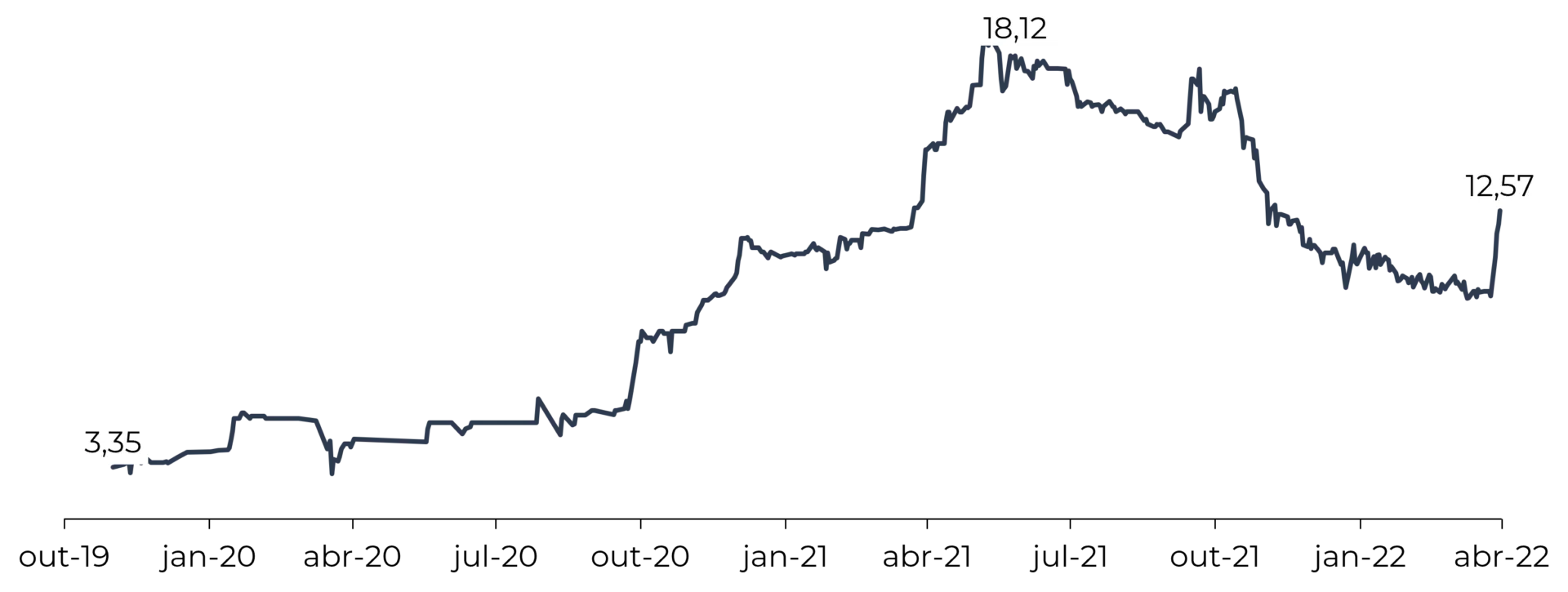 Hoje, esse investimento já se provou bastante rentável, como observado no gráfico de preços da ação abaixo. A tese está descrita em mais detalhes, incluindo nosso racional para aumentar a posição em meio à pandemia, na carta de outubro de 2021.