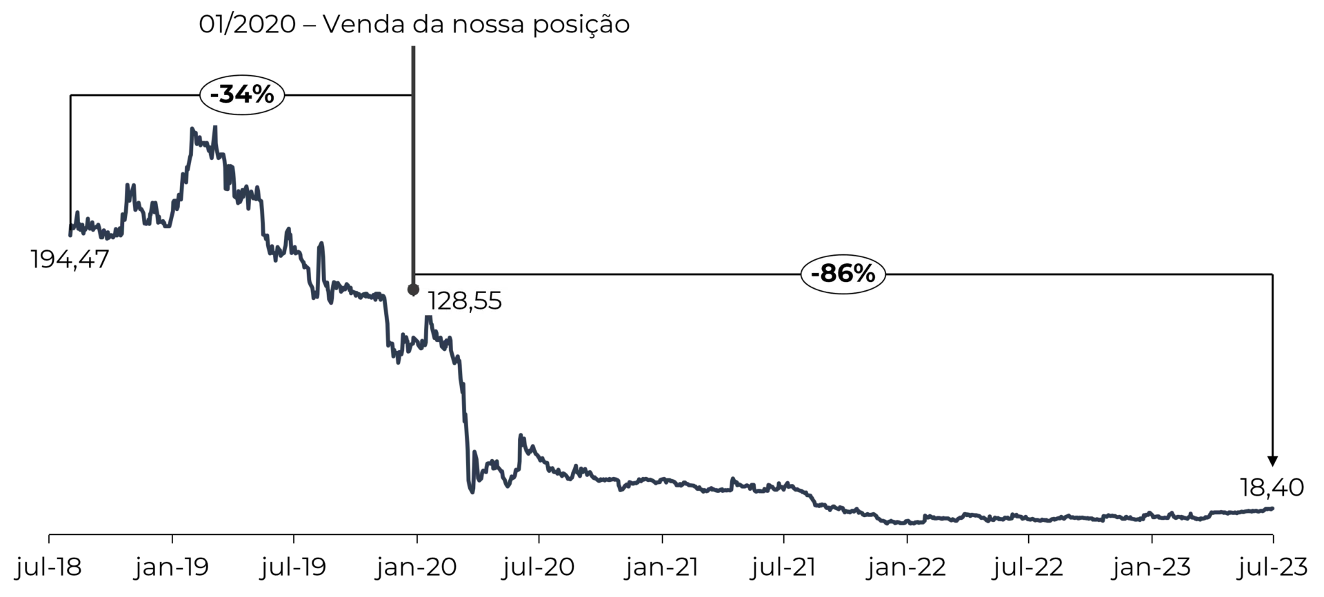 Nos 2 trimestres seguintes, os indicadores operacionais voltaram a piorar. Como reestruturações operacionais são sempre complexas, demos à empresa e ao time de executivos o benefício da dúvida e continuamos investidos. Após 5 trimestres de resultados ruins, no início de 2020 decidimos liquidar nossa posição e tivemos um prejuízo ao redor de 30% do valor investido.