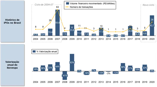 Esse ciclo só é comparável ao período de 2004 a 2007, quando houve um total de 105 IPOs e movimentação total de R$ 81 bilhões.