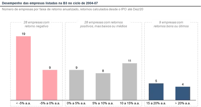 Se a história se repetir, o que nos parece provável, o ciclo de IPOs que estamos vivendo agora deve trazer empresas com enorme dispersão de desempenho. Disciplina para selecionar as melhores oportunidades, investindo em boas empresas, que estejam negociadas a preços justos é o que faz a diferença no longo prazo.