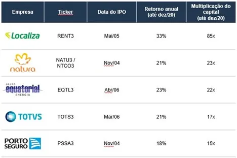 Apesar da média de resultados ruins, a janela de 2004 a 2007 trouxe excelentes empresas para a bolsa, que foram capazes de trazer significativa geração de valor aos seus acionistas. Dentre elas, destaques para Localiza, Natura, Equatorial, Totvs e Porto Seguro, todas com multiplicação do capital investido em pelo menos 15x.