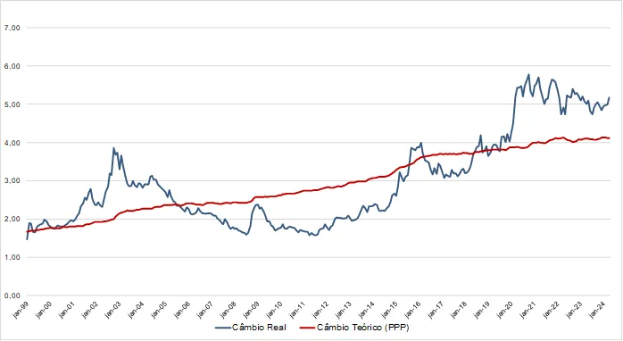 A grande desvantagem de investir no exterior é ter que lidar com o risco de variação da taxa de câmbio, que é como o preço de commodities: impossível de prever. Em teoria, a relação entre duas moedas deveria variar apenas em função da diferença entre a inflação nas duas moedas, mas, na prática, a taxa de câmbio real pode passar períodos muito longos distante desse ponto de equilíbrio teórico. Por exemplo, a análise abaixo mostra a relação entre dólares e reais (USD/BRL) desde 1999, quando o Brasil adotou o regime de câmbio flutuante. A linha vermelha é o que deveria ter sido a taxa de câmbio ao longo do tempo se a teoria funcionasse perfeitamente e a linha azul é o câmbio real.