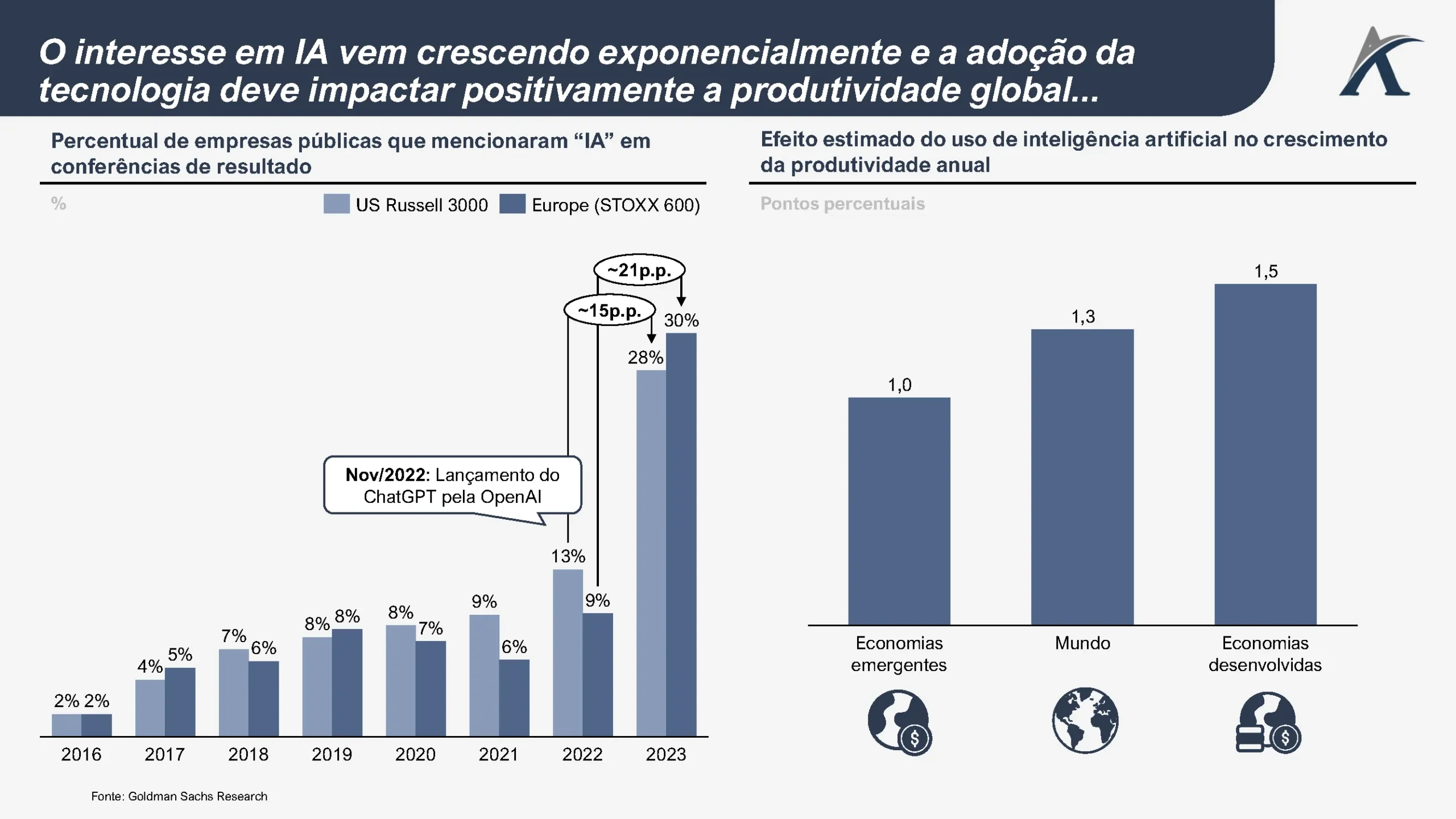 Empresas já utilizam essa tecnologia em marketing, automação, chatbots e análise de dados e acredita-se que a IA pode agregar 1,3 pontos percentuais à produtividade global.