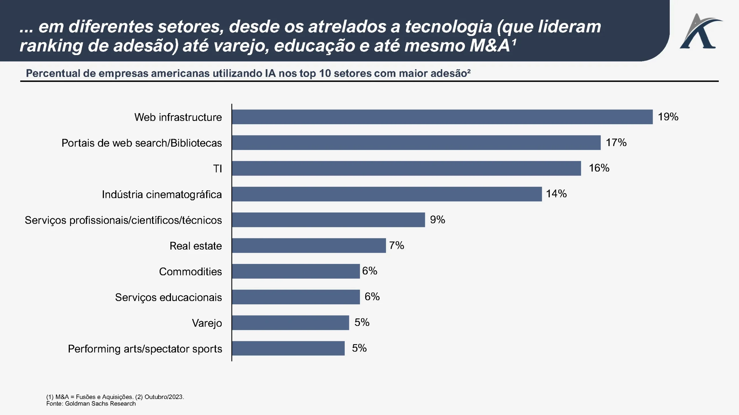 A IA generativa está transformando a economia global, com adoção acelerada em diversos setores, desde tecnologia da informação, até varejo, indústria cinematográfica e até mesmo a indústria de M&A.