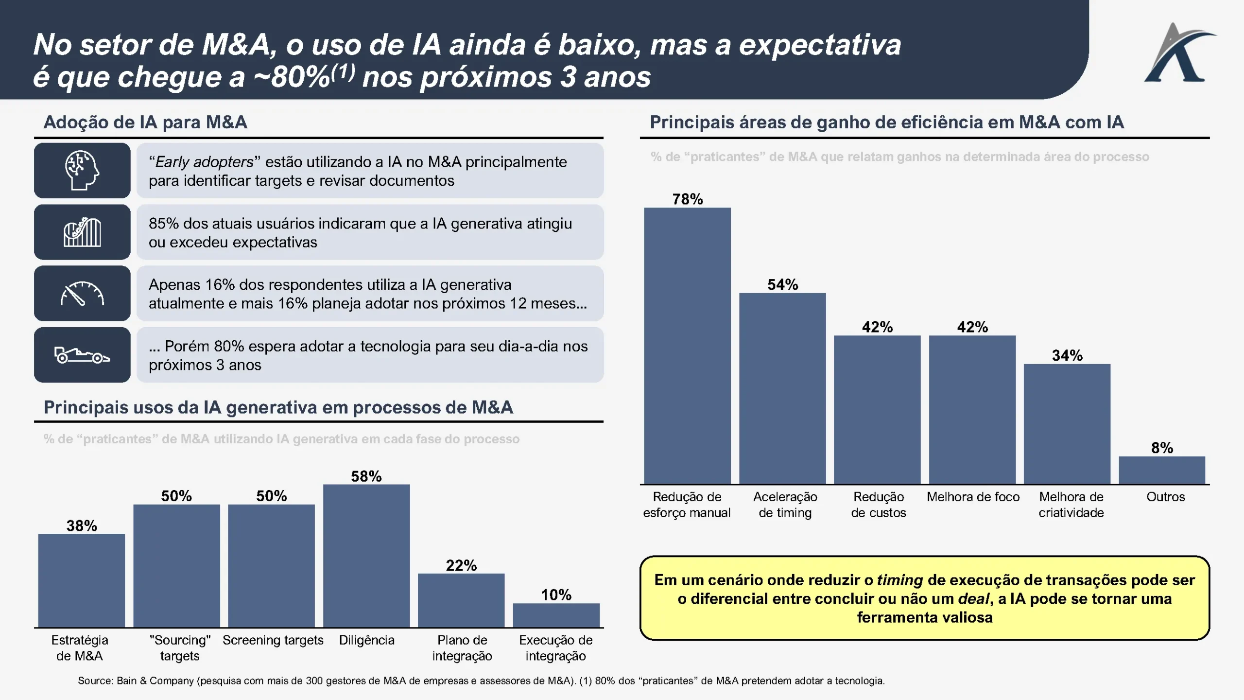 No segmento de M&As, a adoção do uso de IA generativa ainda é baixo (apenas 16%), mas espera-se que cresça rapidamente, já que comprovadamente são inúmeros os benefícios em termos de produtividade e timing de transações para quem já está utilizando.