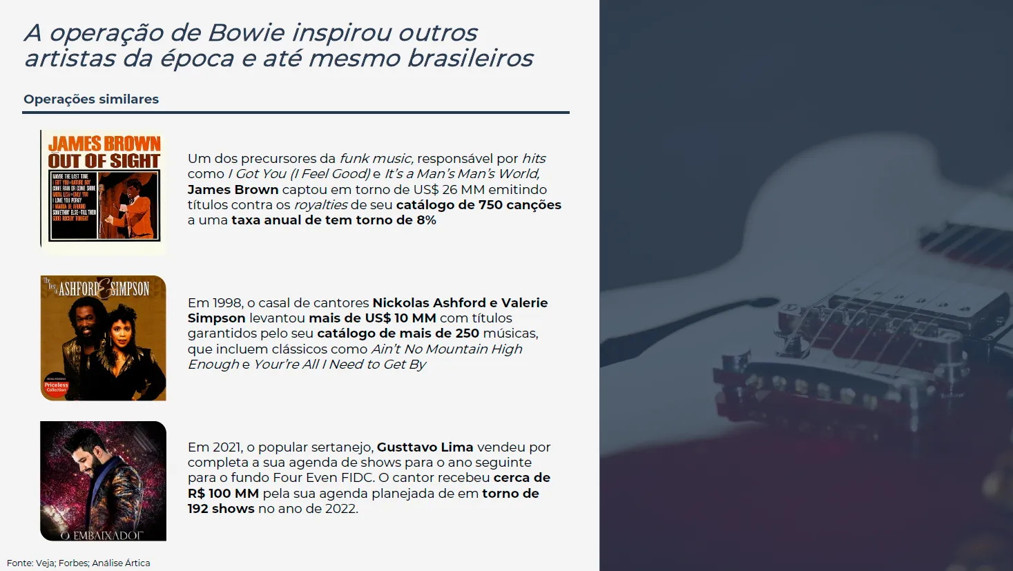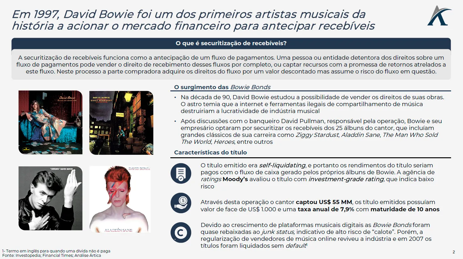 Em 1997, David Bowie foi uma das primeiras pessoas a antecipar recebíveis atrelados a propriedade intelectual, que neste caso era a própria obra do autor. O cantor captou o equivalente a U$ 55 MM, que corrigidos pela inflação seriam equivalentes a cerca de U$ 102 MM hoje em dia. Sua operação serviu como exemplo futuro a outros artistas, inclusive brasileiros.