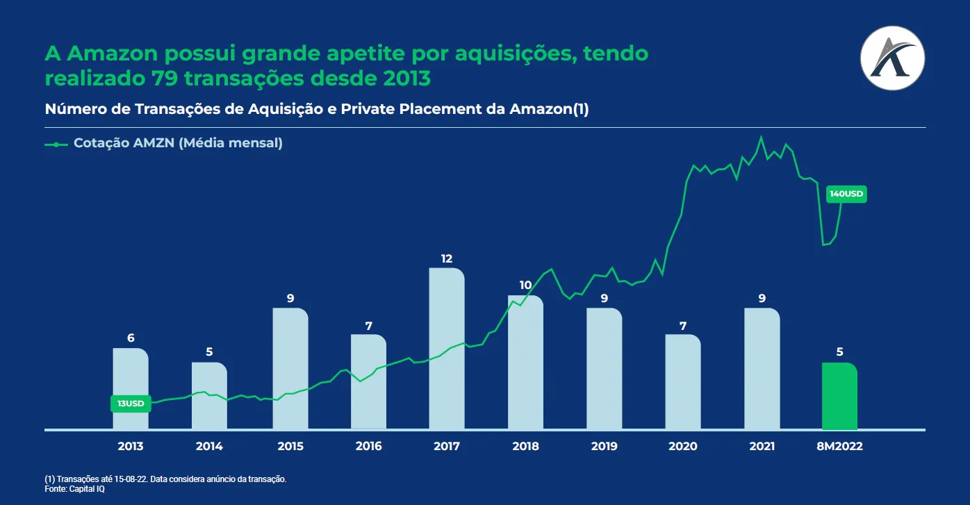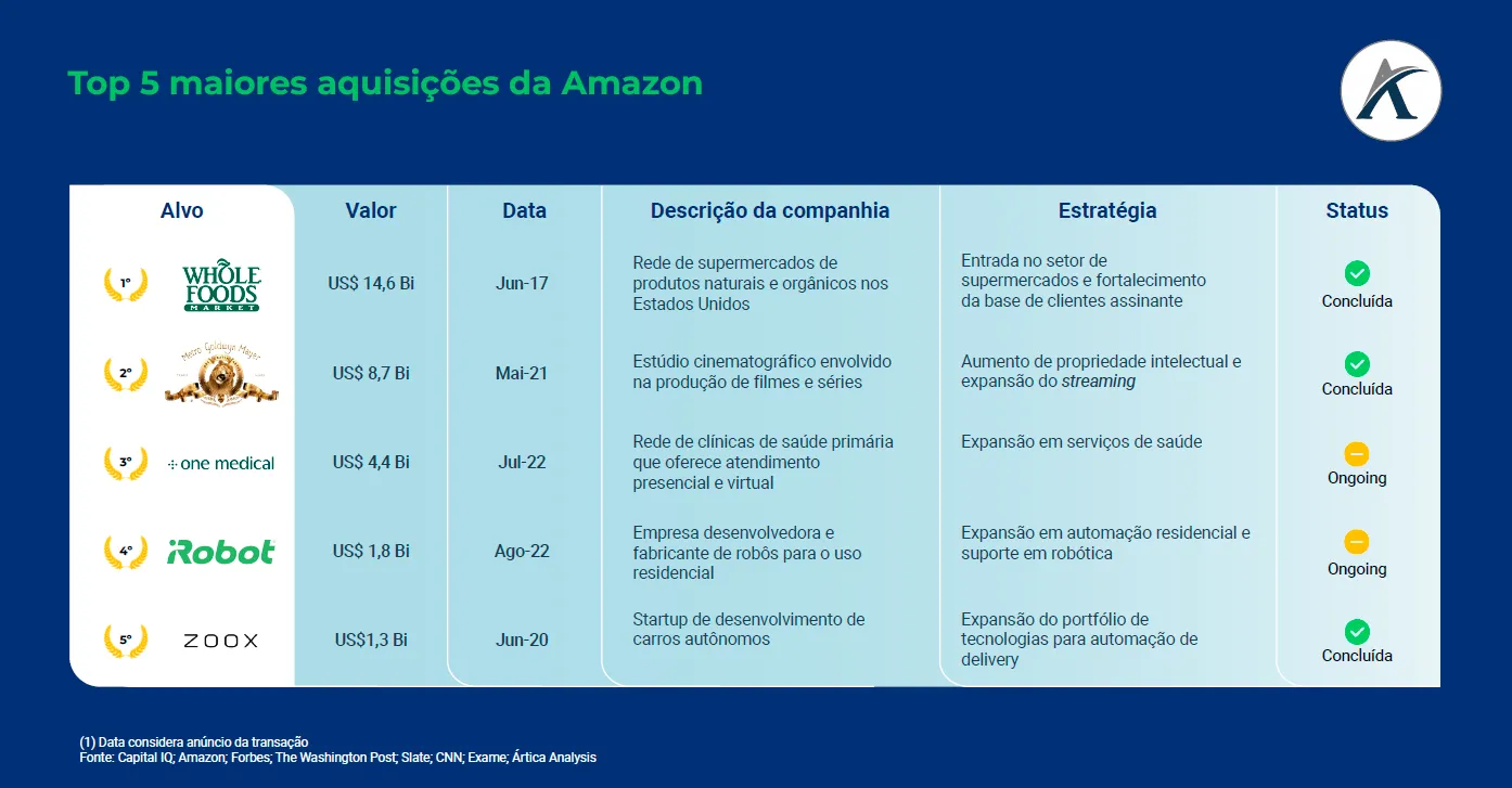 A Amazon é hoje uma das empresas mais valiosas do mundo, possuindo valor de mercado superior a US$ 1,0 trilhão. Nem todos sabem, mas ela é uma empresa extremamente aquisitiva, tendo realizado mais de 70 M&As na última década.