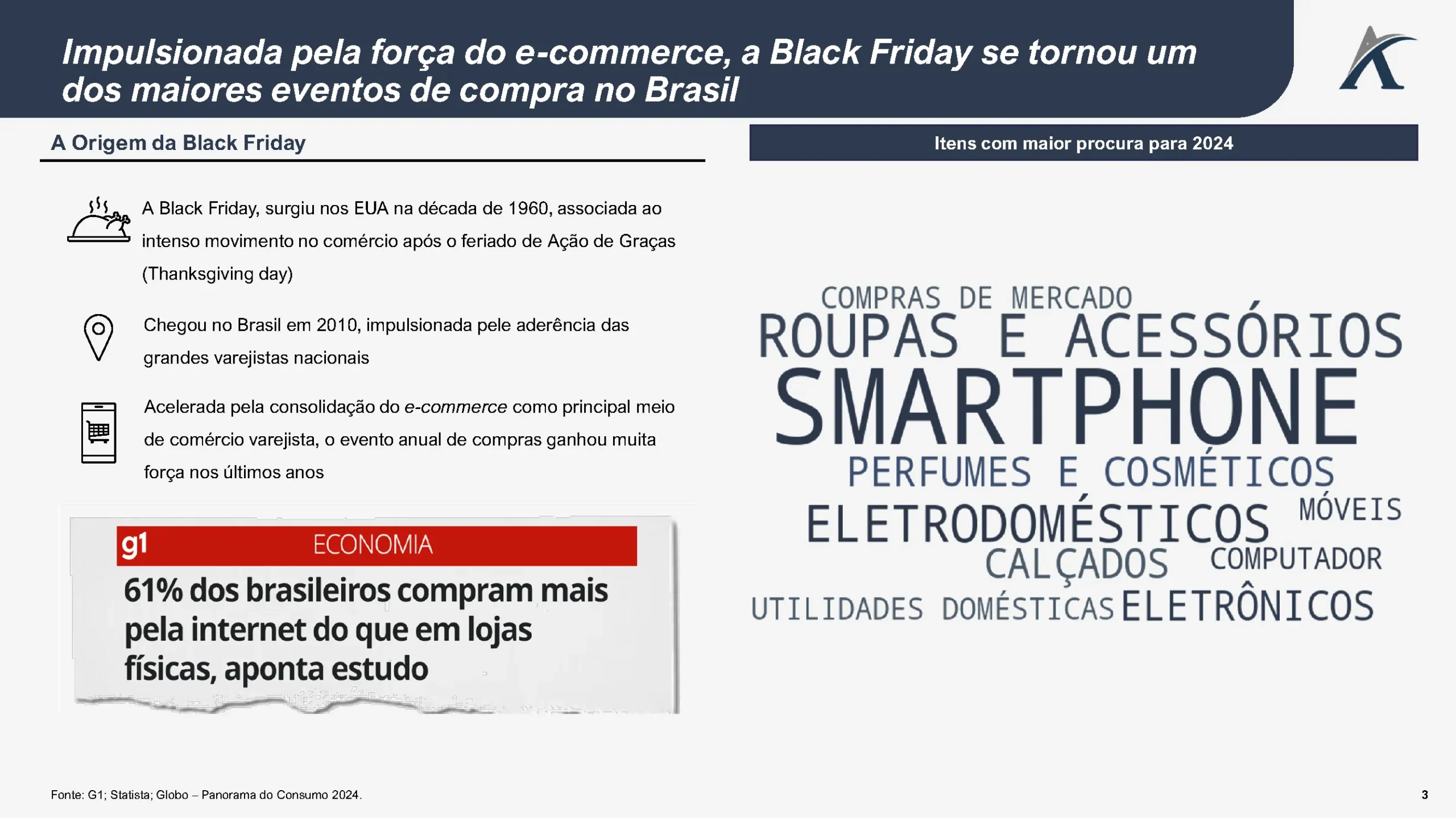 A Black Friday, originada nos EUA na década de 1960 e introduzida no Brasil em 2010, consolidou-se como um dos maiores eventos de compras do país. Impulsionada pelo crescimento do e-commerce, ela se tornou um marco para o varejo, com destaque para produtos como smartphones, roupas, cosméticos e eletrodomésticos. Além disso, é o pontapé inicial da alta temporada de vendas, que, junto ao Natal, concentra mais de 20% do faturamento anual do setor varejista.