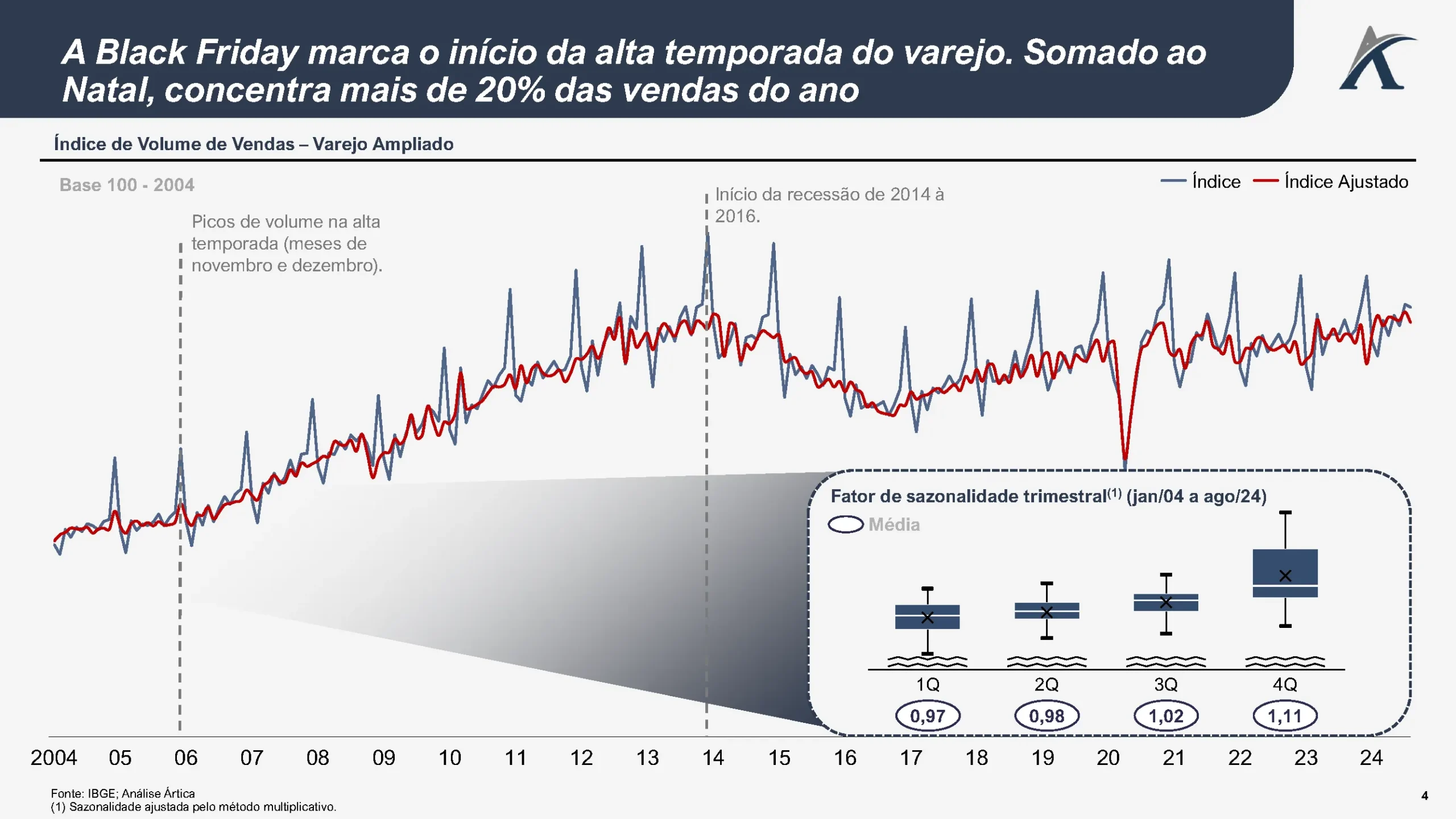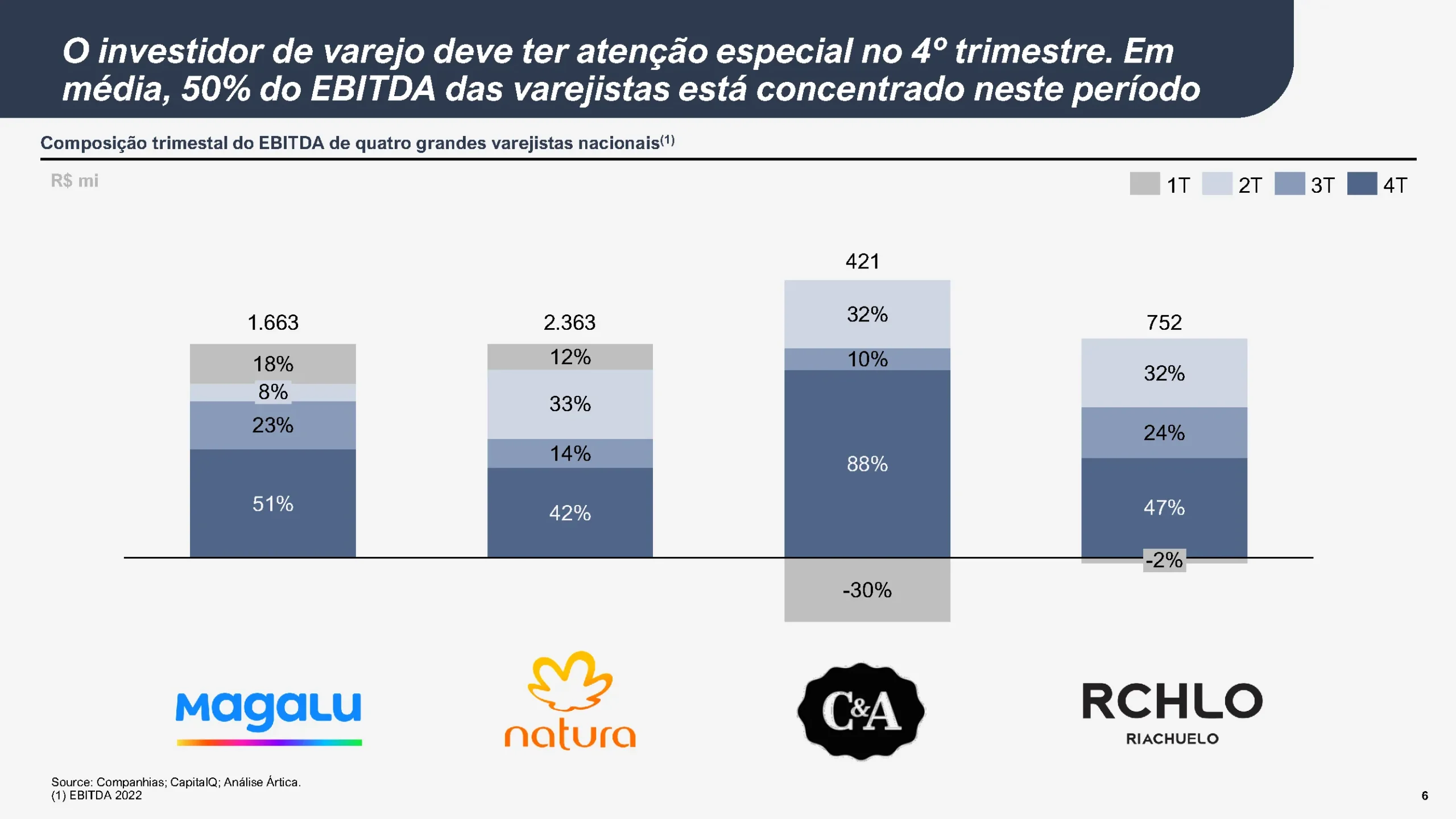 O 4º trimestre é um período de atenção redobrada aos investidores, dado que em média 50% do EBITDA das varejistas tende a se concentrar neste período tornando-o crucial para a apuração do resultado destas empresas.