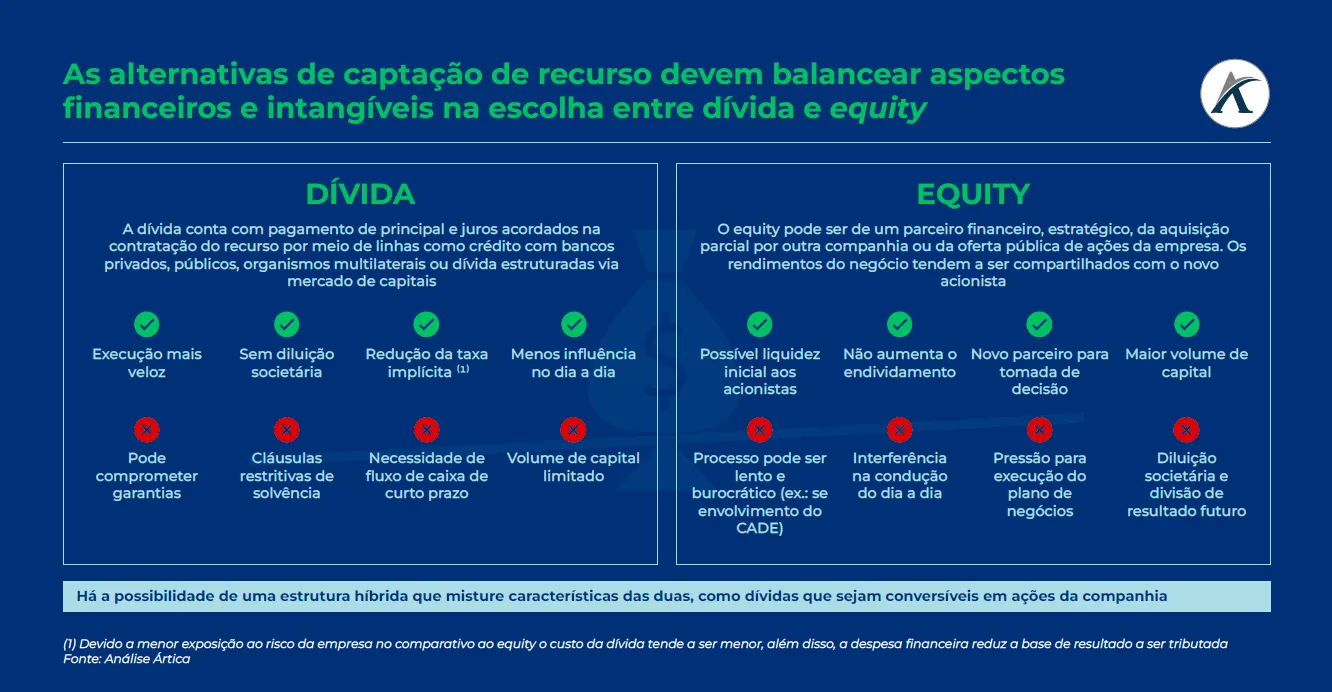 Todo empresário em algum momento refletiu sobre as alternativas disponíveis para levantar recursos para seu negócio, seja para expandir sua operação, investir em novos projetos ou levantar capital de giro. A dúvida de aportar dinheiro via equity ou dívida é comum no mundo corporativo e a decisão entre estas alternativas é complexa por envolver a gestão de fatores como prazo, liquidez, volume, estrutura de capital, entre outros aspectos intangíveis de estratégia.
