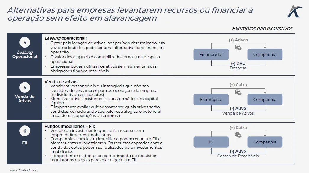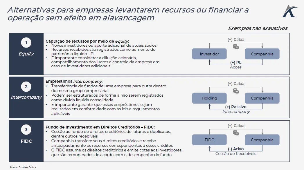 Dessa forma, existem opções de captação para companhias que estão preocupadas com o cumprimento de covenants financeiros ou desejam preservar sua capacidade de endividamento adicional. As estratégias mais utilizadas ocorrem através de equity, instrumentos alternativos de dívida (FIDC, FII, leasing operacional), captações intercompany e venda de ativos.