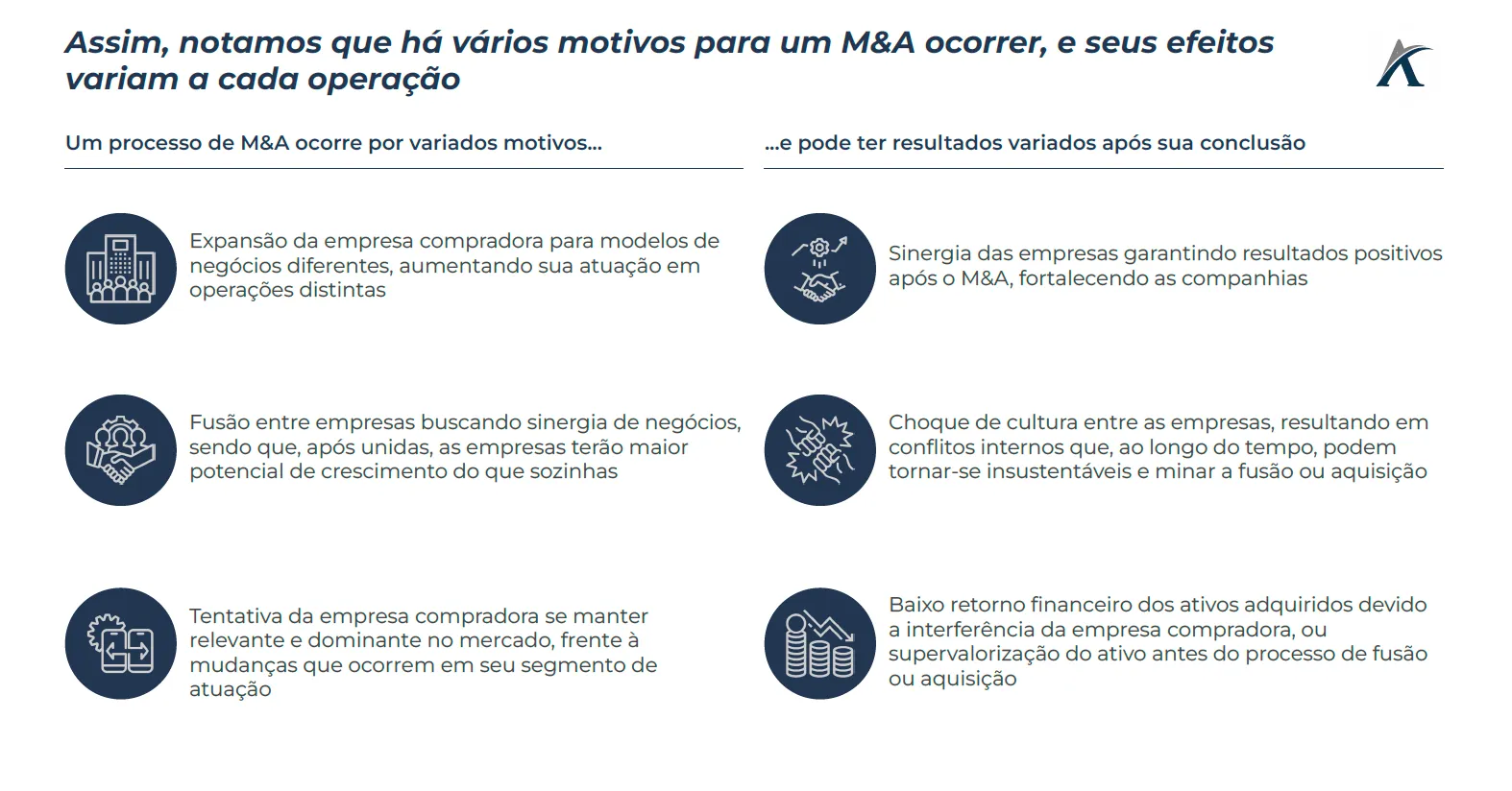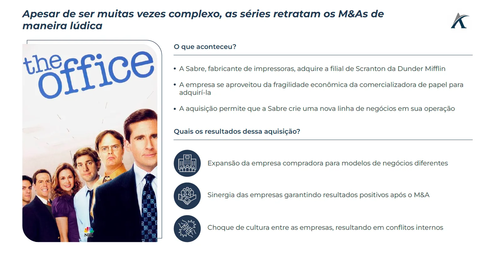 Nesses exemplos, pode-se notar alguns dos motivos que levam a uma fusão ou aquisição de uma empresa por outra. Em The Office, a comercializadora de papel e empresa central do enredo, Dunder Mifflin, declarou falência em 2009 (6ª temporada). Com graves problemas gerenciais e filias deficitárias, a empresa teve parte de sua operação adquirida pela Sabre, fabricantes de impressoras, que buscou expandir sua distribuição de papel e consolidar sinergia com sua principal atividade. Assim, a Sabre se aproveitou da fragilidade econômica da comercializadora de papel para adquirir os ativos lucrativos para sua operação (e fazendo com que a filial de Scranton mantivesse suas operações plenamente).