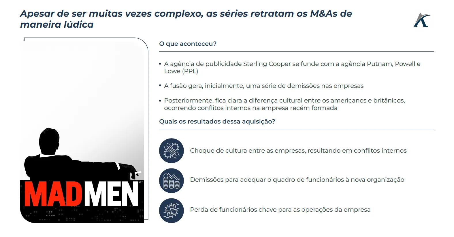 Nas séries, podemos ver também os efeitos que ocorrem após a realização de uma fusão. Em Mad Men, a agência de publicidade Sterling Cooper, sediada em Nova York, e a Putnam, Powell, and Lowe, agência britânica de publicidade, se fundiram no ano de 1962. Os efeitos da fusão são vistos na terceira temporada, com demissões ocorrendo e um forte conflito de cultura entre as empresas, especialmente devido às diferenças regionais enfrentadas.