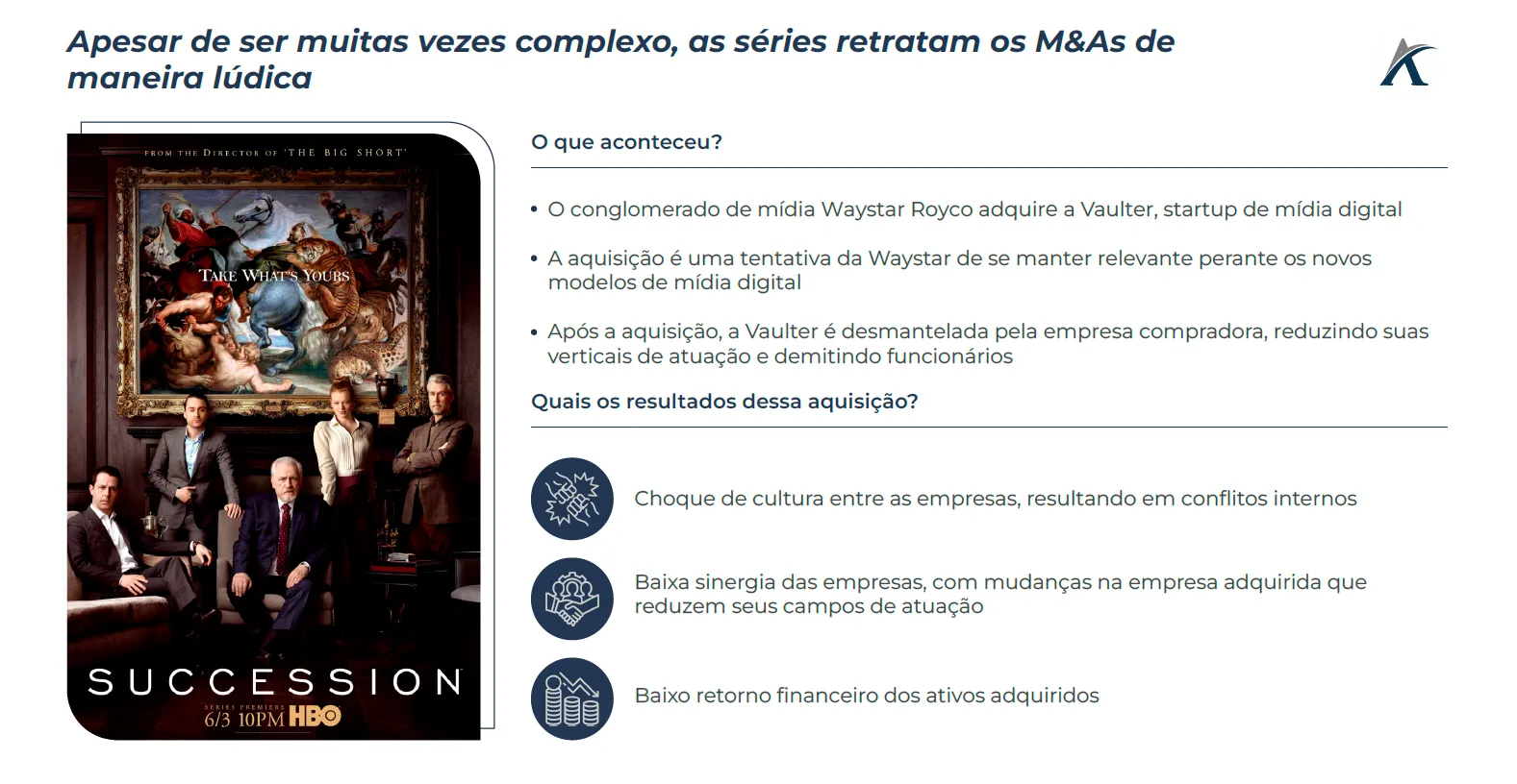 Por fim, podemos ver também casos em que, após uma aquisição, a empresa compradora promove mudanças na adquirida que afetam suas operações que antes geravam bons resultados. Em Succession, o conglomerado Waystar Royco adquire, na 1ª temporada, a empresa Vaulter, de mídia digital, em uma tentativa de se manter atualizada frente à mudanças no segmento midiático. Porém, a Waystar promove mudanças significativas na empresa adquirida, reduzindo os segmentos de atuação da startup e demitindo produtores, afetando a operação da adquirida.