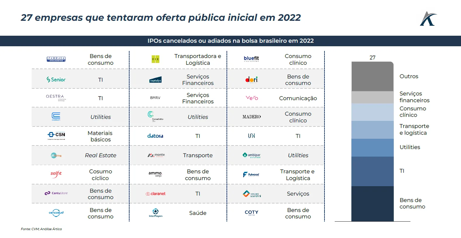 No contexto brasileiro, após um período movimentado com mais de 70 transações entre 2020 e 2021, ainda não houve nenhuma nova oferta em 2022 devido ao cenário de desestabilização no mercado de capitais no ano. Tal situação foi gerada a partir das incertezas globais decorrentes da retomada pós pandemia e a Guerra da Ucrânia, somadas a elevação da taxa de juros no país e a polarização política em ano eleitoral. Consequência disso é que, durante o ano, 27 empresas já desistiram ou adiaram suas ofertas.