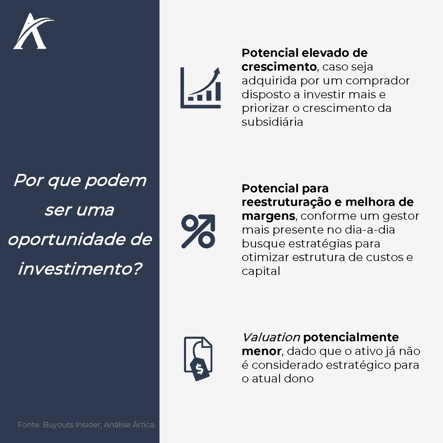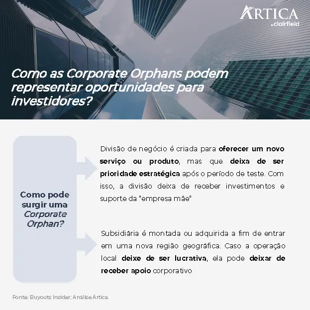 Esses “órfãos corporativos” são oportunidades para investidores bem-posicionados, que podem adquirir a subsidiária ou divisão a um preço descontado e impulsionar seu crescimento e lucratividade.