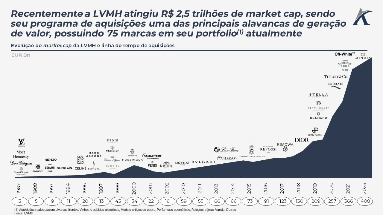 Vamos entender melhor esses movimentos e como eles geram valor para uma Companhia estudando o caso do maior conglomerado de luxo do mundo, o grupo LVMH, gerido pelo famoso Bernard Arnault.