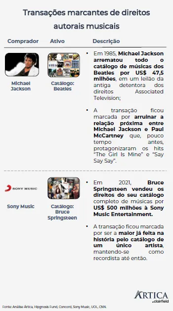 Exemplos notáveis de transações de compra e venda incluem a aquisição dos direitos autorais dos Beatles por Michael Jackson em 1985 e a compra do catálogo de Justin Bieber pela Hipgnosis Songs Capital em 2023.